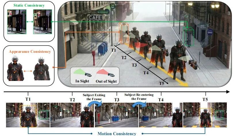 图 1 混合记忆要求模型在保持背景静态一致性的同时,在动态对象处于视野外的时间间隔内,维持其运动与外观的一致性。