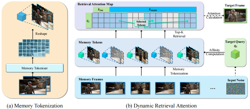 在生成视频的过程中,一个基于时空相关性的检索模块会计算当前 query 与 memory key 之间的匹配程度,然后选出最相关的 top‑k 个 token。