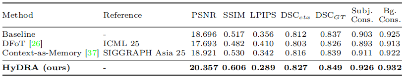 模型必须在保持静态背景的同时追踪运动对象,以维持其外观与运动一致性。为此,提出混合动态检索注意力 HyDRA(Hybrid Dynamic Retrieval Attention)的记忆机制,旨在相机运动条件下,在保持静态背景连贯性的同时,寻求隐藏对象并维持动态一致性。