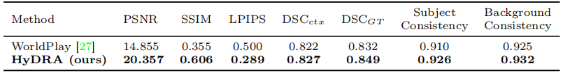 表 2 展示了与以卓越一致性著称的先进商业模型 WorldPlay 零样本性能的比较。所提方法在所有指标上均超越 WorldPlay,PSNR 差距尤为显著(高出 5.502)。这些结果凸显了所提模型的卓越能力,证明了其相对于已有商业模型的优越性。