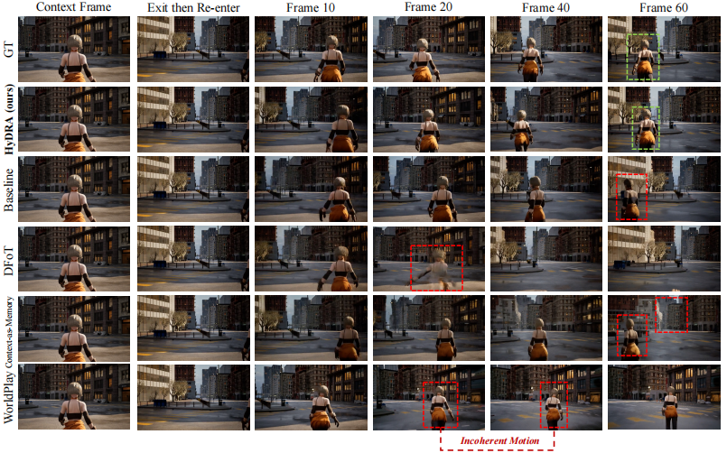 这种有选择性的检索可以把关键的运动和外观信息引入生成过程,帮助模型“重新发现”之前消失的对象,并在它们离开视野后再出现时,自然地接续上原有的运动轨迹。