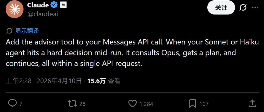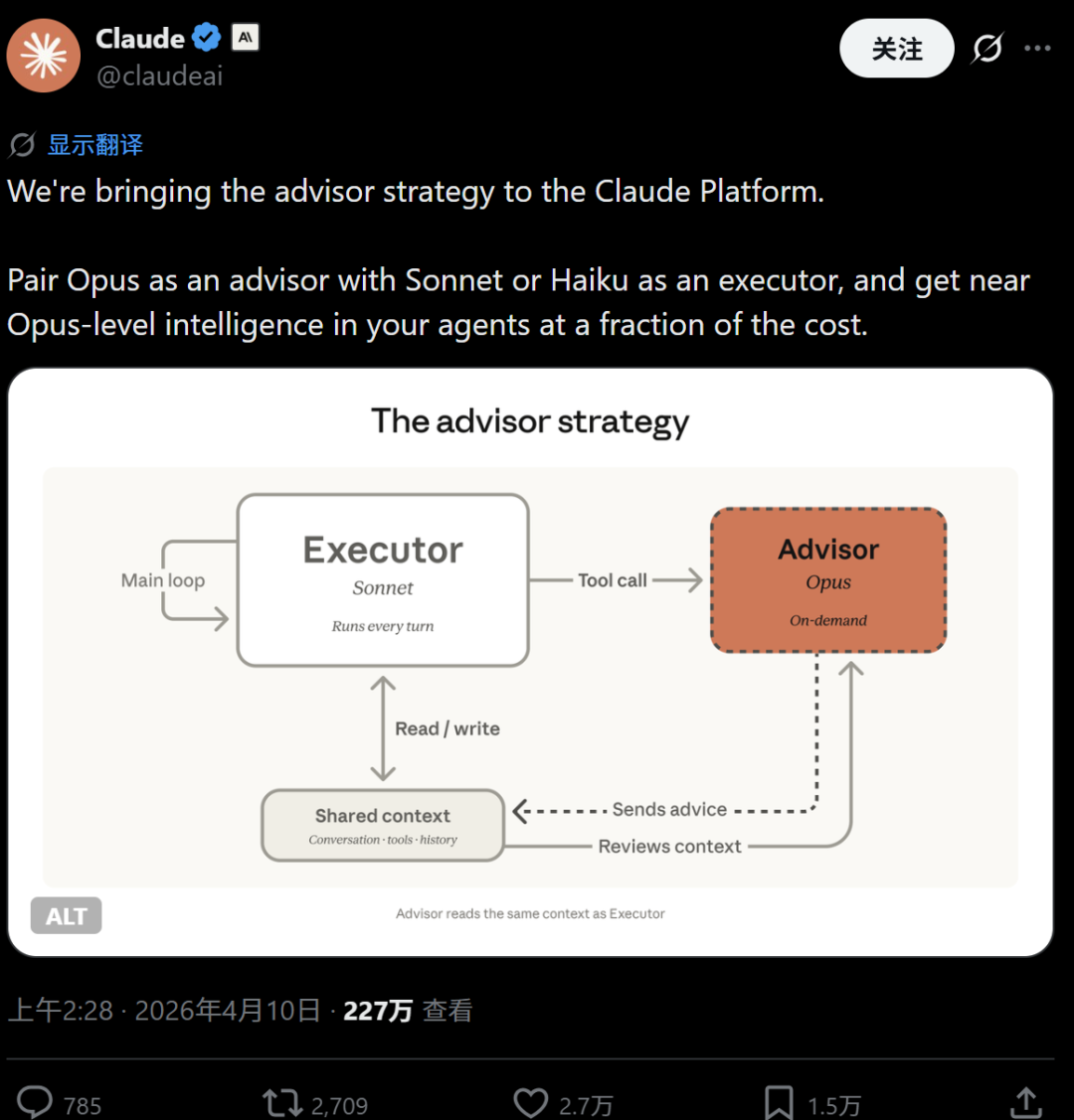 4月10日,Claude官方宣布,将advisor strategy引入Claude平台。