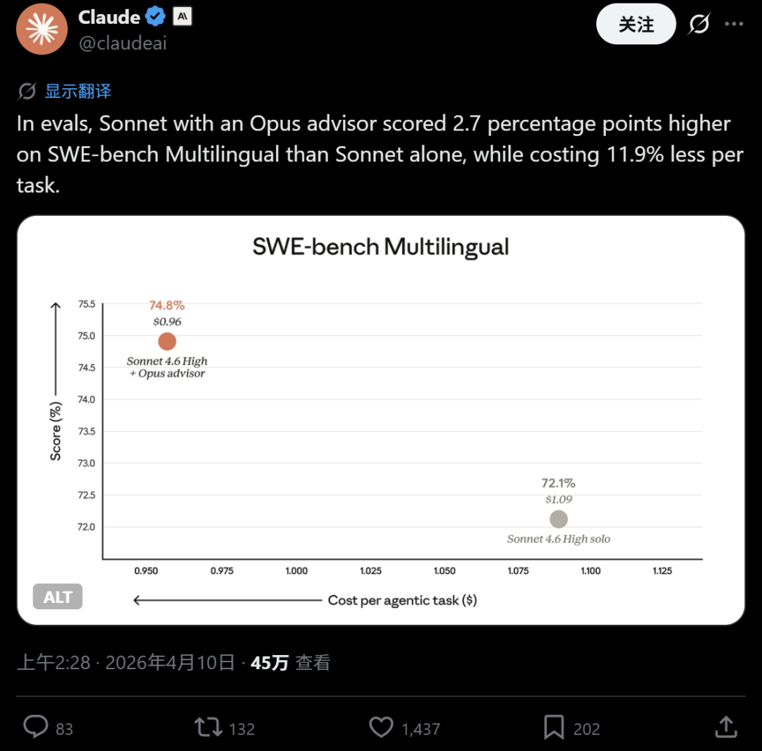 作为评估,Claude官方介绍称,配备Opus作为顾问的Sonnet在SWE-bench Multilingual上比单独的Sonnet高2.7%,而每个任务成本降低11.9%。