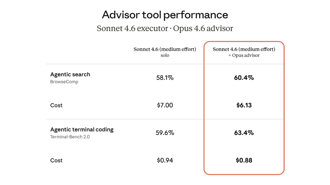 该策略的核心就是,让相对较低消耗的模型(Sonnet/Haiku)担任智能体的主要执行者,而Opus则作为外部的“导师”来辅助,帮助性能较低的Sonnet/Haiku来解决问题。