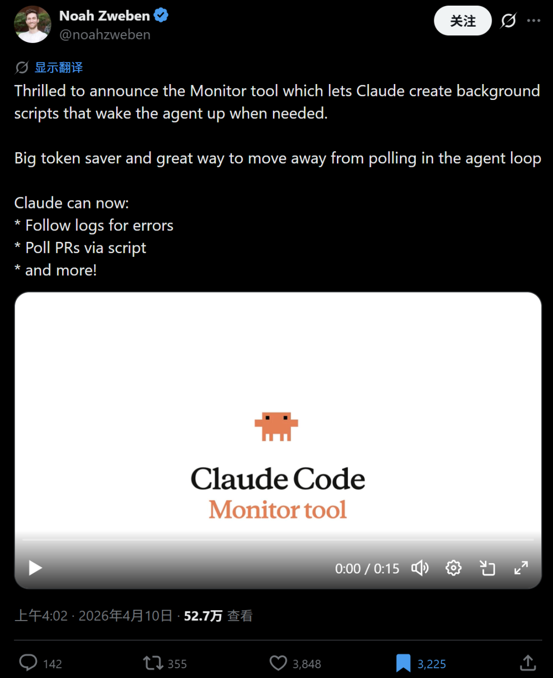 response = client.messages.create( model="claude-sonnet-4-6", # executor tools=[ { "type": "advisor_20260301", "name": "advisor", "model": "claude-opus-4-6", "max_uses": 3, }, # ... your other tools ], messages=[...])# Advisor tokens reported separately# in the usage block.值得注意的是,几乎同一时间,Claude Code PM也发布贴文,宣布在Claude Code中推出一个名为Monitor的工具,让Claude能够创建后台脚本,仅在需要时才唤醒,避免轮询来节省token。