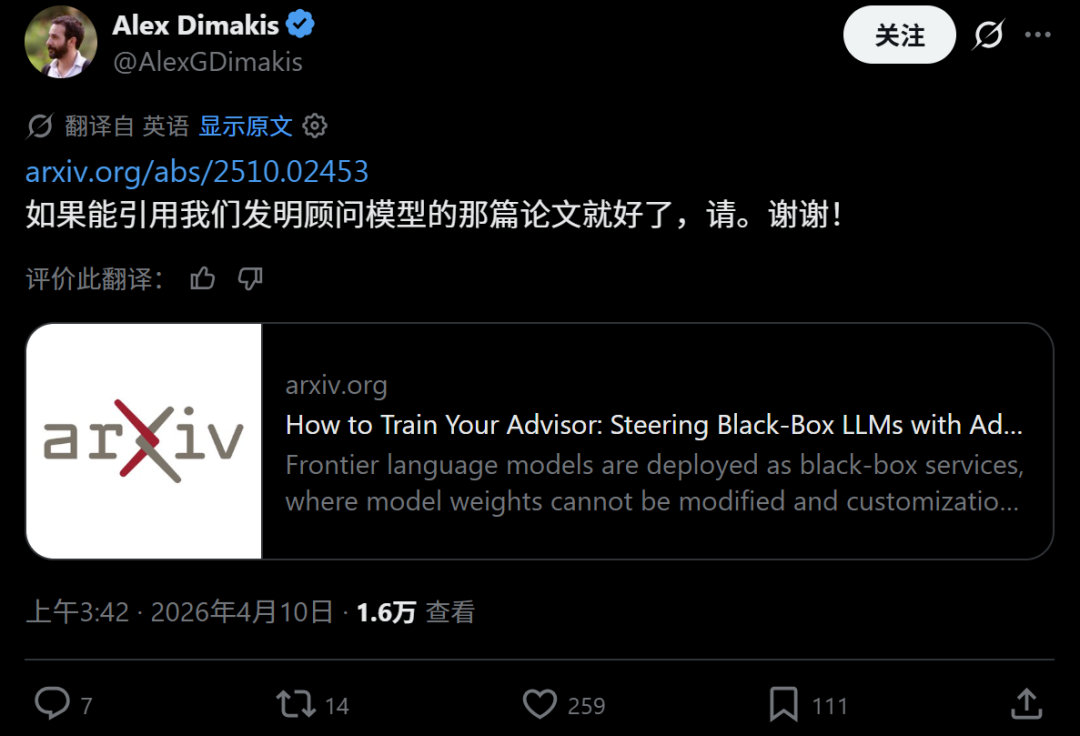 UC Berkeley教授、Bespoke Labs AI创始人Alex Dimakis表示了不满,Advisor模型他们早已提出,但是却未被引用。