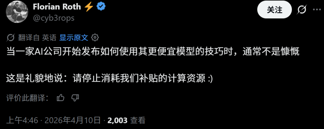 nextron systems研究主管、YARA/Sigma工具作者Florian Roth讽刺地说,Anthropic发布这些使用更便宜的模型、减少token用量的方法,其实是变相告诉用户“请停止消耗我们受赞助的算力”。