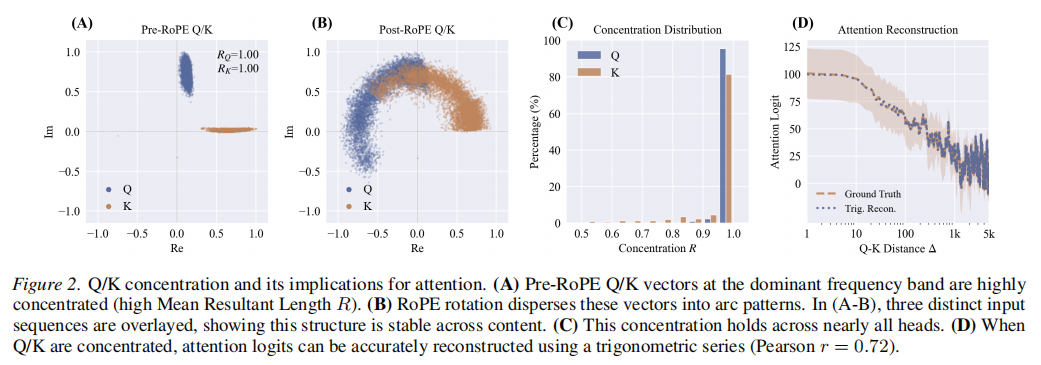 研究团队观察到,在绝大多数注意力头中,Pre-RoPE 的 Q/K 向量并不是分散无序的,而是围绕固定的非零中心高度聚集。研究团队用平均合向量长度(Mean Resultant Length, MRL) 来衡量这种集中性,R 越接近 1,说明方向越集中。实验结果表明,这种 Q/K 集中现象在 Qwen3-8B 的大多数注意力头中都很明显,而且在数学、代码、对话等不同领域数据以及不同模型架构中都较为稳定,说明它并非偶然噪声而是较普遍的模型内在结构。