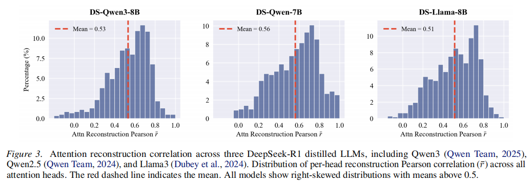 基于这一点,研究团队重新审视了 RoPE attention 的表达。标准 RoPE 下,attention logit 可写成各频带上 的求和,其中 是 query 与 key 的相对距离。当 Pre-RoPE 的 Q/K 足够集中时,就可以用中心向量近似原始向量,此时 attention logit 近似退化为仅依赖相对距离 的三角级数。这样,一个 attention head 对近距离、远距离或特定距离 token 的偏好,就可以被写成由 Q/K 中心决定的距离偏好曲线,而不再只是经验上的观察。研究团队进一步验证:由离线校准得到的 Q/K 中心构造的三角级数,能够较好重建 attention 的距离偏好,在多个模型上都表现出较高相关性。