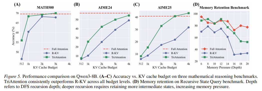 研究团队还通过递归状态查询任务测试了记忆保留能力。结果显示,在较低到中等记忆压力下,TriAttention 与 Full Attention 表现接近,而 R-KV 在递归深度增大后出现明显性能崩塌。这表明 TriAttention 并不只是“压得更狠”,而是在压缩 KV cache 的同时,更稳定地保留了长链推理中的中间状态。