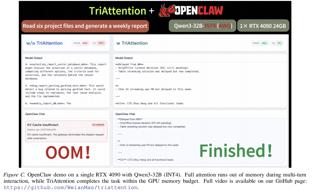 除主实验外,研究团队还在附录中补充了更广泛的验证,包括 LongBench、RULER 上的泛化测试,与 LazyEviction、H2O、StreamingLLM 等更多基线的对比,以及 RTX 4090 上运行 INT4 量化 Qwen3-32B 的 OpenClaw 单卡部署 demo。这些结果更多承担“泛化能力与工程可用性验证”的作用,说明 TriAttention 不仅在数学推理上有效,也具备进一步推广到一般长上下文任务和实际部署场景的潜力。