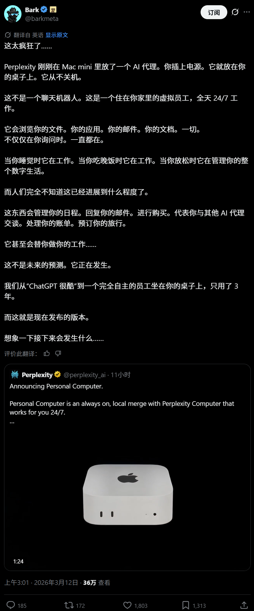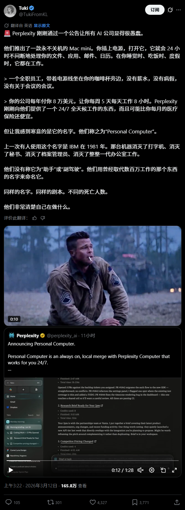 还有影响力账号Tuki发帖引发了大量网友赞同,他在帖子中用夸张的口吻称“Perplexity 这一公告让所有 AI 公司看起来都蠢爆了。它是一个永不关机的 Mac mini,像全职员工一样工作,无需薪水、无需请假。”,他甚至进一步地说,“上次用‘Personal Computer’这个名字的是 IBM 在 1981 年,那台机器消灭了打字机、秘书和档案员。这次同样会取代无数办公室职位,他们知道自己在做什么。”