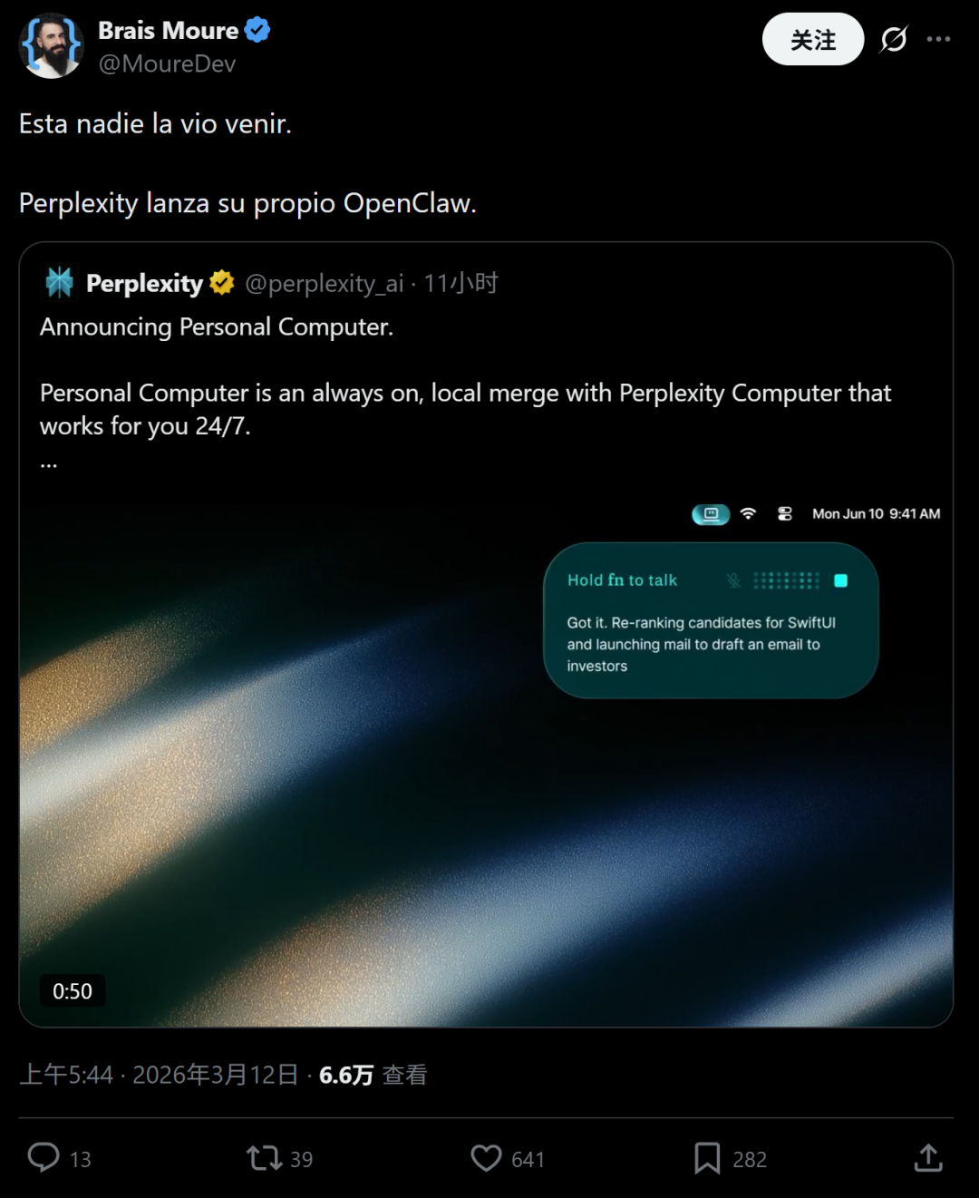 而本次升级推出的Perplexity Personal Computer,则是将这一能力本地化。它的本质可以算得上是一个始终在线的AI操作系统,通过一台持续运行的Mac mini,接入Perplexity云端后,就能像OpenClaw一样,提供对本地文件、应用和会话的访问权限。虽然当前该产品正处于waitlist阶段,但是发布后,就立刻引发了非常热烈的反响。