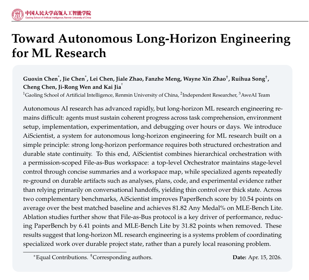 也正因为如此,AiScientist 给出的启示并不局限于机器学习研究工程本身。它更像是在提醒整个 AI for Research 社区:未来更强的研究智能体,也许不仅要“会推理”“会生成”“会调用工具”,还要学会在长时间跨度里保留什么、继承什么、继续推进什么。
