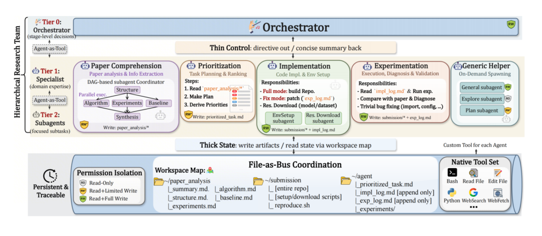 系统设置了顶层 Orchestrator 负责阶段级决策与流程推进,同时将论文理解、任务规划、代码实现、实验执行和诊断修复等工作交由不同角色处理。这样做的价值,不只是“多几个 agent”,而是让每个角色都在更合适的局部上下文中工作。