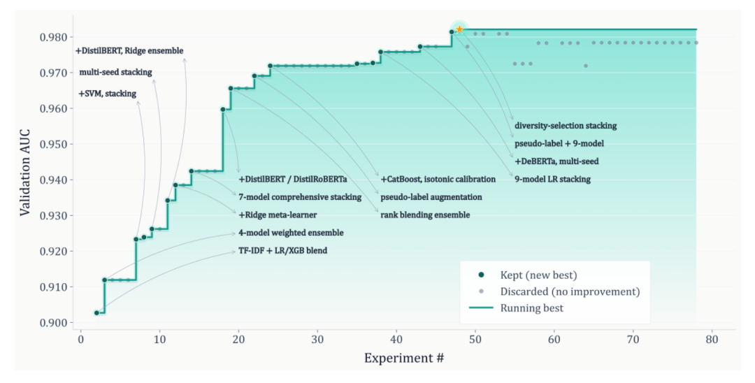在 MLE-Bench Lite 的 Detecting Insults 任务上,AiScientist 在 23 小时内自主完成了74 轮实验循环,将 validation AUC 从 0.903 提升到了0.982,期间实现了18 次 best-so-far update。