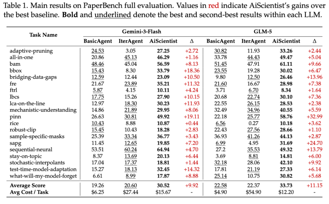 (2)在两个代表性 benchmark 上,AiScientist 都取得了稳定优势