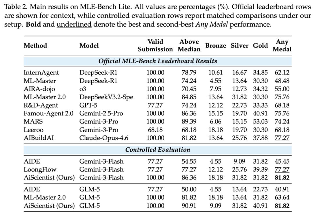 在 MLE-Bench Lite 上,AiScientist 达到了 81.82% Any Medal。论文同时指出,这一成绩相比最佳匹配基线的平均提升达到11.37 个百分点,表明系统不仅能先把流程跑起来,还能在持续实验中不断逼近更好的结果。
