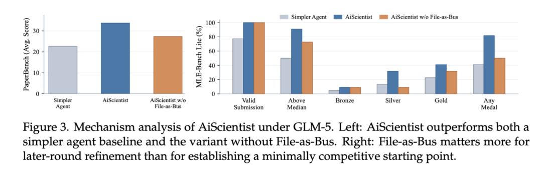 移除 File-as-Bus 后,AiScientist 在 PaperBench 上下降 6.41 分,在 MLE-Bench Lite 上 Any Medal 下降 31.82 个百分点。这说明,状态连续性并不是一个可有可无的辅助设计,而是长程研究工程里真正决定系统能否持续推进的关键机制之一。