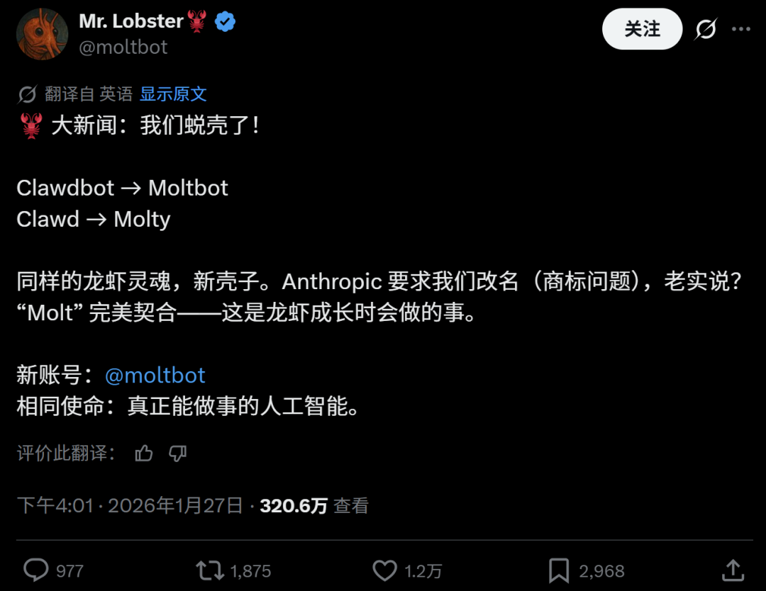 而改名一事起因是Claude模型的母公司Anthropic认为,Clawd和Claude读音和写法太像了,可能导致混淆和商标侵权,因此逼迫Clawdbot更名。于是,Clawdbot便更名为Moltbot。新的名字Molt的意思来源龙虾蜕皮的概念,而Claw是爪子钳子的意思,同时该项目仍然保持了原本的龙虾作为LOGO。其官方账号很幽默地发帖是“同样的龙虾,(但是)新的壳子”,并表示“这是龙虾成长时会做的事情”,一语双关。