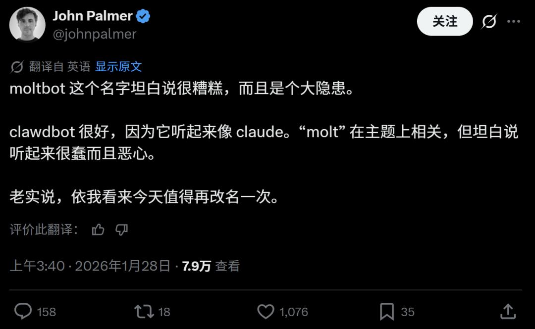 另外,被Sam Altman关注的用户John Palmer发帖批评新的名字太烂了,但是也认为原来的名字确实巧妙关联了Claude。毕竟一个好的名字是一个品牌、一个产品的入口。