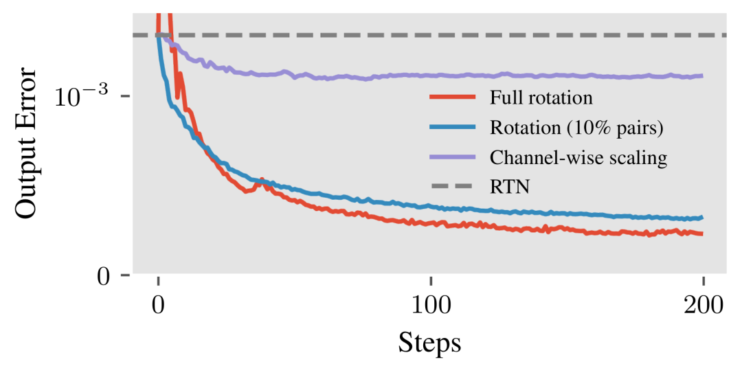 如图2 所示,旋转在降低量化误差方面优于通道级缩放,并且仅保留幅度差异最显著的 10% 通道对进行旋转,其表达能力与完整旋转相当。