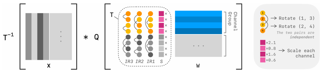 如图3所示,通道维度被划分为固定大小的组(图中组大小为4)。每个权重组(W)首先通过通道级缩放(S)进行变换,然后经过一系列独立旋转(IR)。每个独立旋转由相互独立的配对旋转组成。在变换后,应用量化(Q),其组大小与通道组大小相等。逆变换(T⁻¹)应用于激活值(X)。