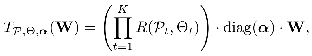 选择一组通道对P = {(i1, j1), . . . , (im, jm)},并依次旋转 P 中的每一对。形式上,给定 P、旋转角度集Θ = {θ1, ..., θm}以及权重矩阵 W,变换后的权重为: