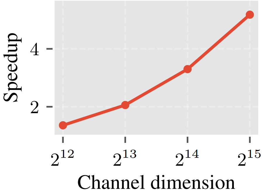 这种三级细粒度并行设计带来了显著优势:首先,由于通道组规模较小(如 128),激活值可完整载入片上共享内存,而旋转所需的配对索引和角度参数则直接驻留在寄存器中,从而大幅减少高延迟的全局内存访问;其次,通道分组显著增加了活跃线程块的数量,尤其在通道数很大时能更充分地占用 GPU 计算单元;最后,组内各旋转对彼此完全独立,无需线程间同步,进一步提升了硬件利用率。如图4所示,缩放后的成对旋转相对于Hadamard变换速度提升。
