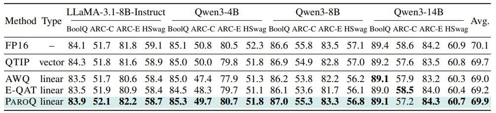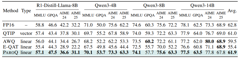 如表1所示,在线性量化方法中,ParoQuant实现了SOTA。在所有尺寸上均表现出高精度,尤其是在LLaMA‑3和4B以下的较小模型等具有挑战性的模型上。
