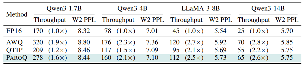 表4展示了ParoQuant在RTXA6000上的解码吞吐量。ParoQuant 仅比 AWQ 慢约 10%,却带来了显著的准确率提升;同时,它在准确率上与 QTIP相当,但推理速度提升了15%-30%。值得注意的是,Qwen3-14B获得了最大的推理加速收益,相较FP16 实现约2.6 倍吞吐量提升,同时保持近乎无损的生成精度。