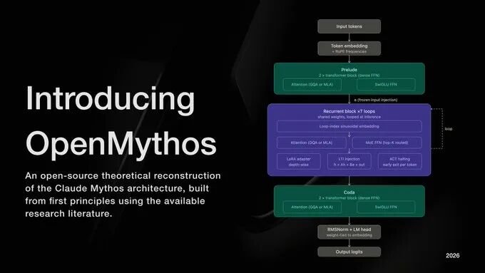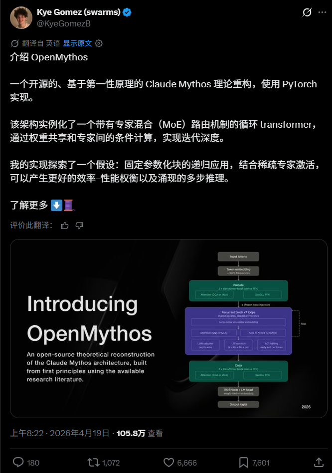 短短十余天后,4月19日,22岁的开发者Kye Gomez基于公开文献与模型行为,推断并发布了Claude Mythos的理论复刻版开源项目OpenMythos。该项目并非Claude Mythos的模型泄露,而是一个从公开论文和社区假设中逆向重建的完整实现。