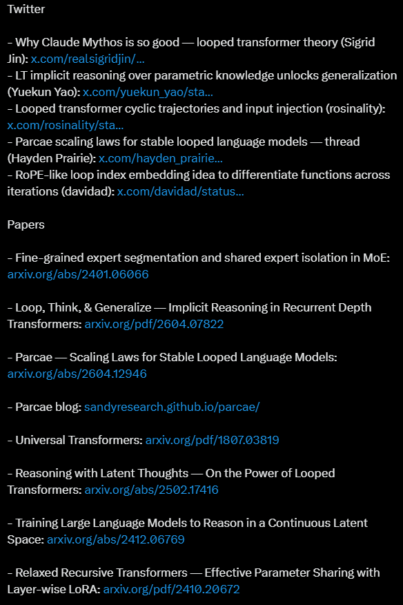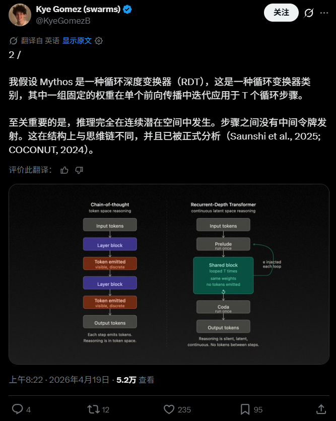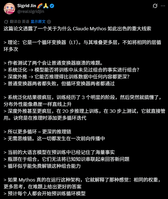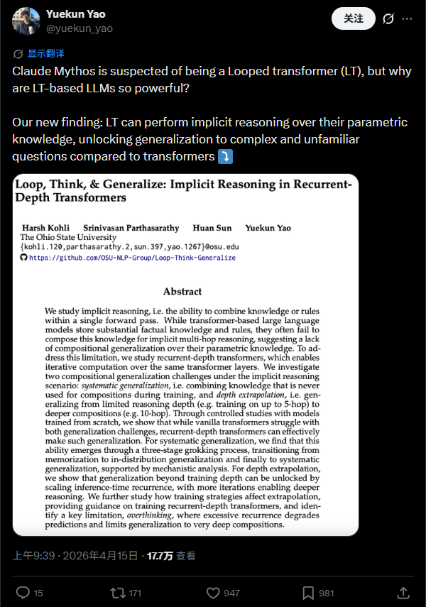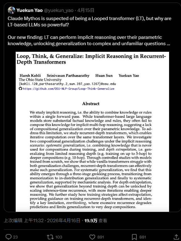 4月15日,用户@yuekun_yao发帖,怀疑Claude Mythos可能是一个Looped Transformer,并发布了论文。