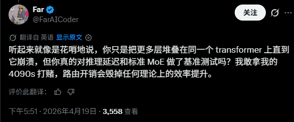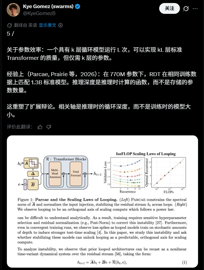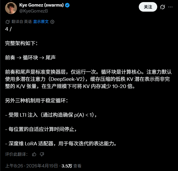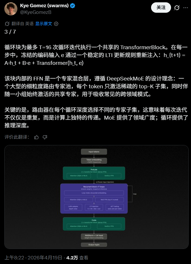 4月16日,那个曾经第一时间把泄露的Claude Code源码重写的用户@realsigridjin阅读该论文后,同样也认为Mythos并非简单堆叠更多的层,而是通过同一组权重在单次前向传播中循环多次实现有效深度。