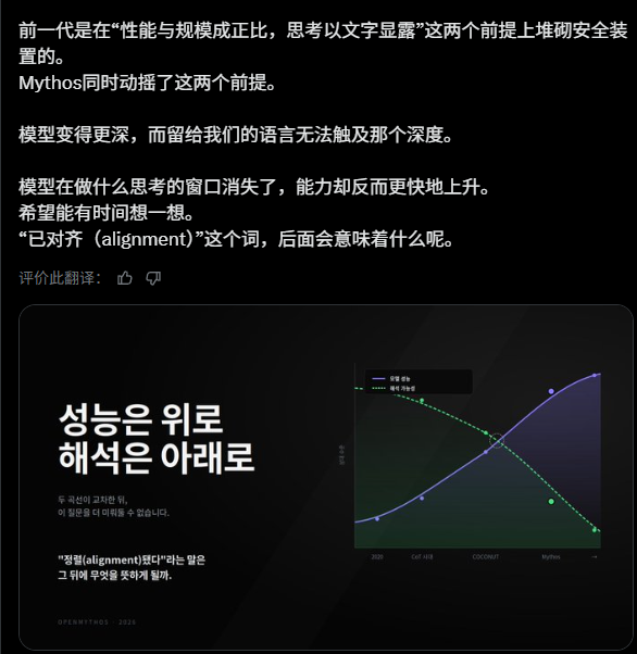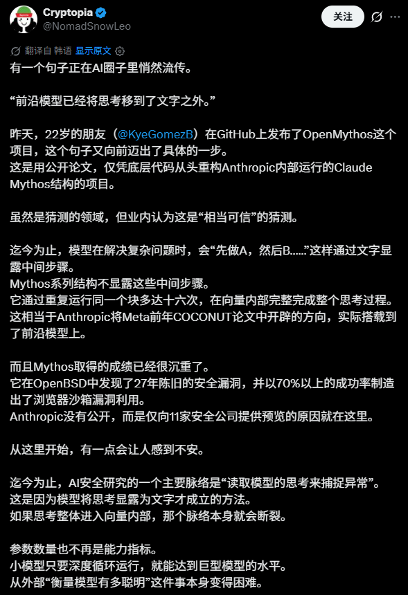 开发者账号Cryptopia长文分析Mythos的这一架构对于对齐、安全研究的冲击。