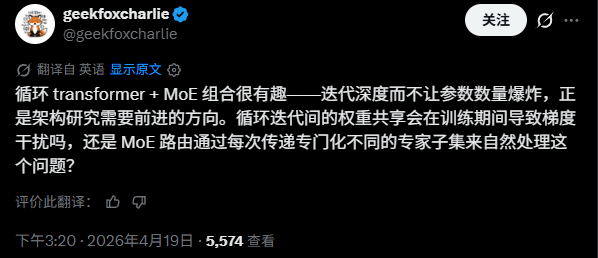 同样的,还有开发者认为使用循环transformer+MoE的组合非常有意思。但是仍然疑问会不会出现梯度干扰等问题。
